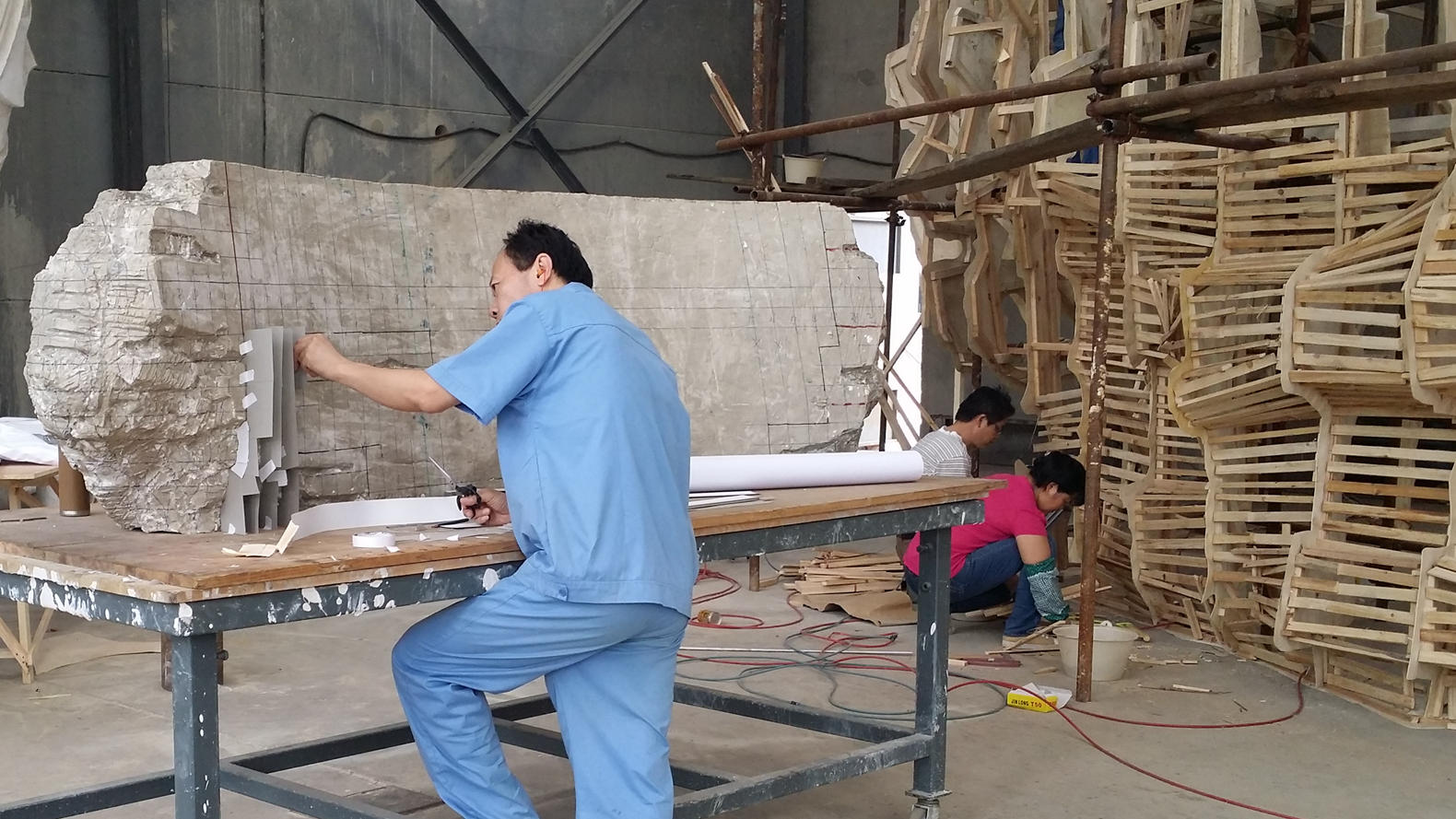 This large chromed stainless steel outdoor sculpture was created by Chinese artist Jing Yumin. In front of it is a huge mirror with a slight curvature. The difference is this mirror panel made up of many regular squares. The regular and straight criss-cross seams do not destroy its aesthetic feeling, but highlight a kind of hierarchical beauty.The back and sides are finished with a patina effect that looks like a huge rock with a mirror set in it.